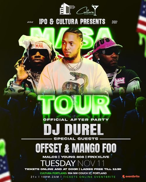 The IPO Group & IPO Entertainment Presents the Official After Party for Migos' DJ Durel, Offset & Mango Foo in Portland, Oregon, at Cultura Nightclub PDX. Come join us for a Tuesday night out with the YRN Family!