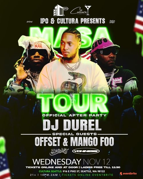 The IPO Group & IPO Entertainment Presents the Official After Party for Migos' DJ Durel, Offset & Mango Foo in Seattle, Washington, at Cultura Nightclub Seattle. Come join us for a Tuesday night out with the YRN Family!